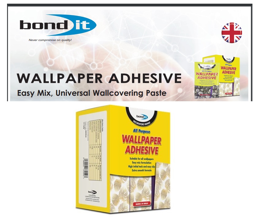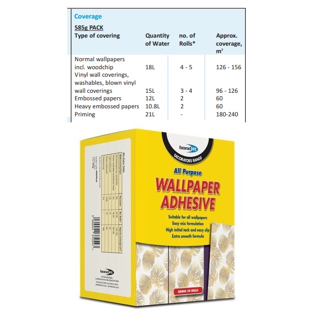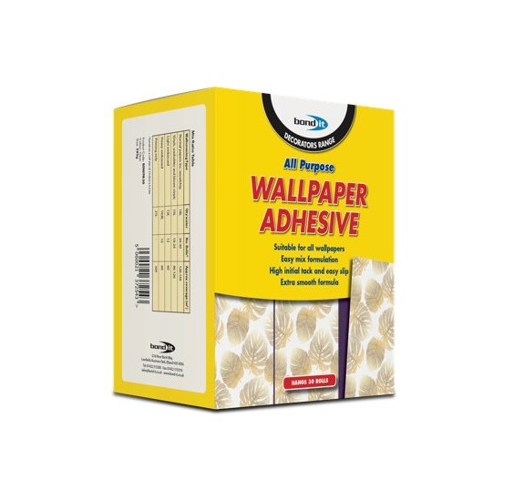 Bond It WALLPAPER ADHESIVE, when mixed with water, provides an all-purpose paste suitable for hanging all common wallcoverings including lining paper, blown, sculptured, woodchip, textured vinyl, washable and heavy embossed. It can also be used for fixing polystyrene tiles and as a primer for new plaster walls. Has a durable, extra strong formula for long lasting results. It has fast mix properties for quick and easy preparation.